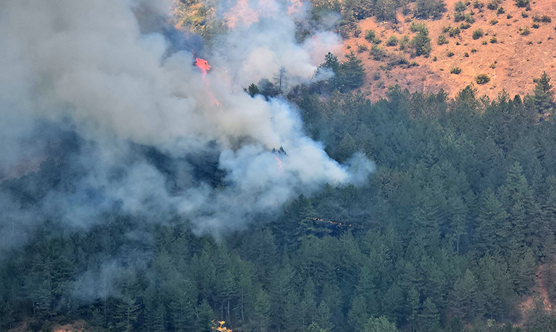 Öğle saatlerinden itibaren rüzgarın da etkili olduğu bölgede alevler bir anda parlayarak şiddetini arttırıyor. Bölgenin karaçam olması nedeniyle yangının etkisi artarak devam ederken, yangını kontrol altına alma çalışmaları sürüyor.