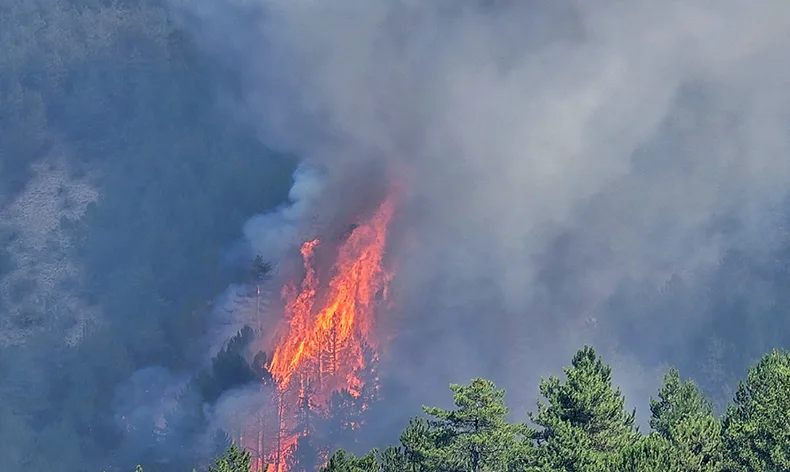 Öğle saatlerinden itibaren rüzgarın da etkili olduğu bölgede alevler bir anda parlayarak şiddetini arttırıyor. Bölgenin karaçam olması nedeniyle yangının etkisi artarak devam ederken, yangını kontrol altına alma çalışmaları sürüyor.