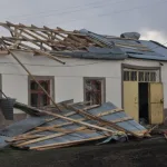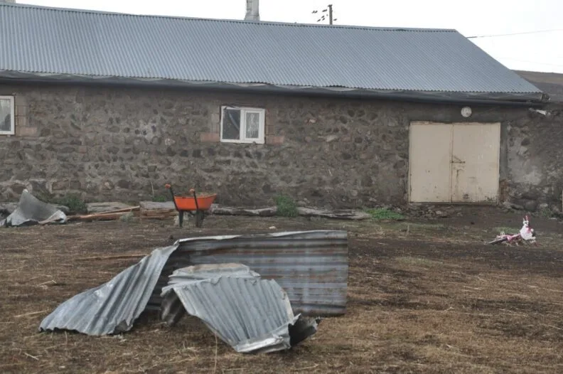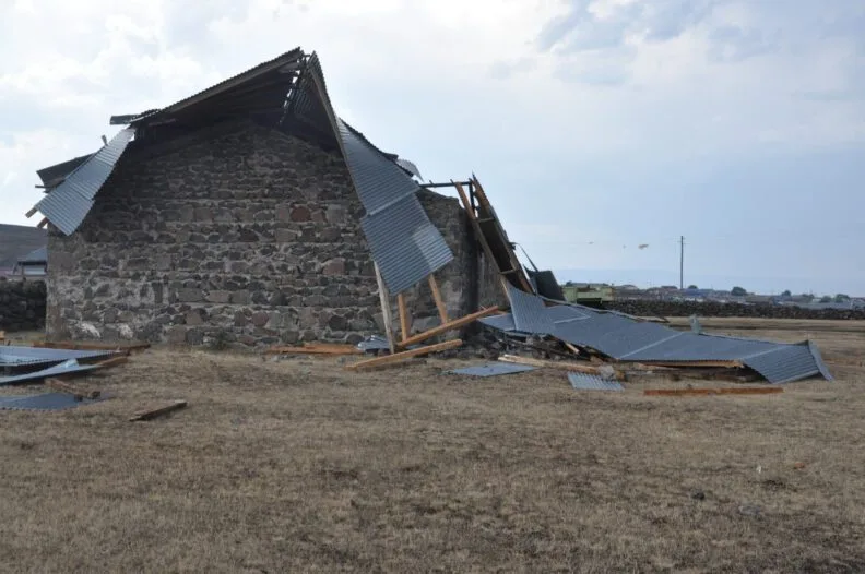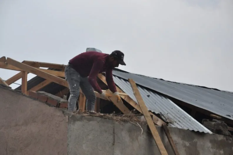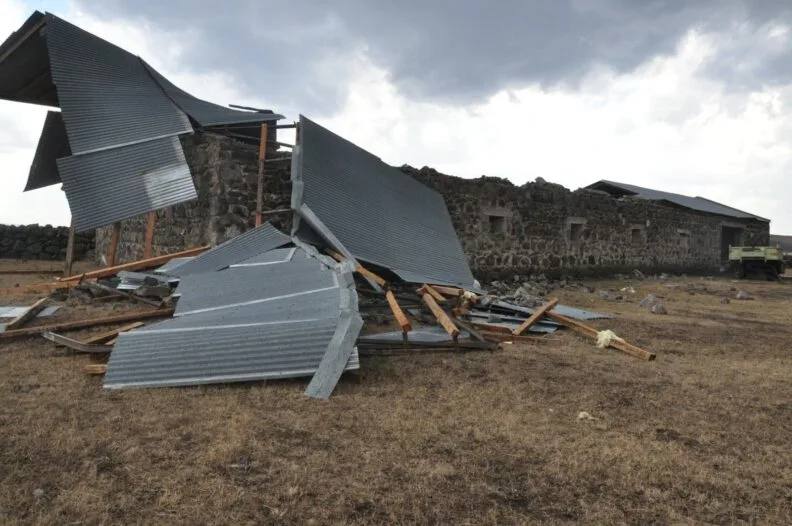Kars merkez Halefoğlu köyünde çıkan hortum evlerin çatılarını metrelerce uzağa attı. Hortumdan 15 ev hasar görürken, vatandaşlar ne yapacağını şaşırdı. TEDAŞ elektrik ekiplerinin köy içerisinde kopan enerji hatlarının onarımını yaparken, vatandaşlar uçan çatılarını topladı.