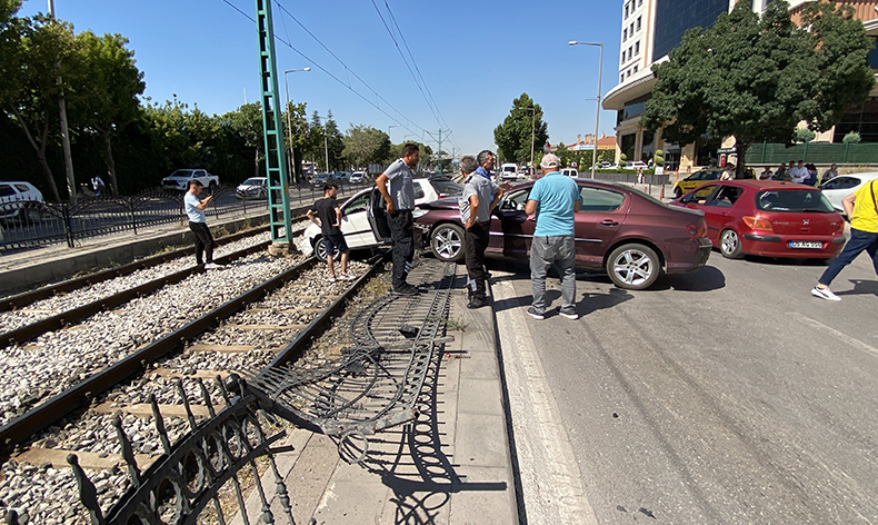 Kaza, saat 15.30 sıralarında merkez Selçuklu ilçesi Musalla Bağları Mahallesi Ahmet Hilmi Nalçacı Caddesi’nde meydana geldi.  Belh Caddesi istikametine seyir halinde olan sürücüleri öğrenilemeyen otomobil ile  otomobil çarpıştı. Çarpışmanın etkisiyle demir korkulukları aşan araç, tramvay yoluna düştü. Kazada 2 kişi yaralandı. İhbar üzerine olay yerine yerine sağlık ve polis ekipleri sevk edildi. Yaralılar, ilk müdahalenin ardından ambulanslarla Konya Şehir Hastanesine kaldırıldı.
