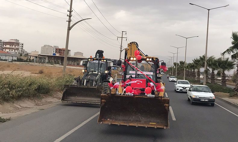 Manisa’nın Turgutlu ilçesinde yaşayan kepçe operatörü Veli Acar, evleneceği Şeyma Kanat’ın babaevine içek ve balonlarla süslediği kepçeyle ile gitti. Gelin arabası gibi süslenen kepçeyi gören konuklar, iş makinası ile hatıra fotoğrafı çektirdi. Damat Veli Acar, gelin alma töreninden sonra düğün salonuna gitmek için oluşturulan düğün konvoyuna yine süslediği kepçeyle katıldı.