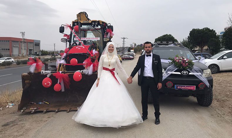 Manisa’nın Turgutlu ilçesinde yaşayan kepçe operatörü Veli Acar, evleneceği Şeyma Kanat’ın babaevine içek ve balonlarla süslediği kepçeyle ile gitti. Gelin arabası gibi süslenen kepçeyi gören konuklar, iş makinası ile hatıra fotoğrafı çektirdi. Damat Veli Acar, gelin alma töreninden sonra düğün salonuna gitmek için oluşturulan düğün konvoyuna yine süslediği kepçeyle katıldı.
