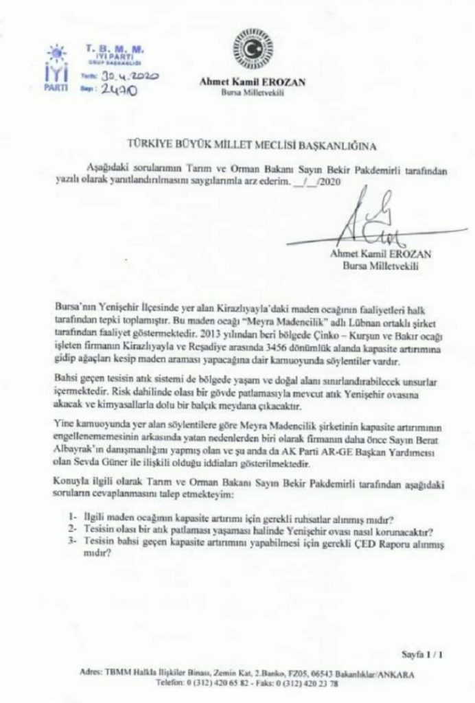 İYİ Parti Bursa Milletvekili Ahmet Kamil Erozan’da konuyu Meclis gündemine yaşadı. Yapılmak istenen maden ocağının halk tarafından tepki topladığı belirtilen önergede, Tarım ve Orman Bakanı Bekir Pakdemirli’nin yanıtlaması istemiyle 3 soru yönetildi: