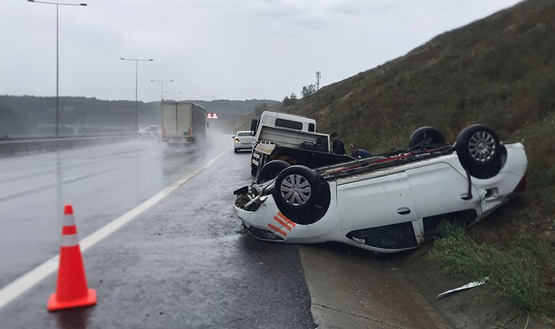 Otomobil sürücüsü Erkan K. yağışlı havanın etkisiyle kaygan zeminde direksiyon hakimiyetini kaybederek orta refüjde bulunan bariyerlere çarpıp takla attı.