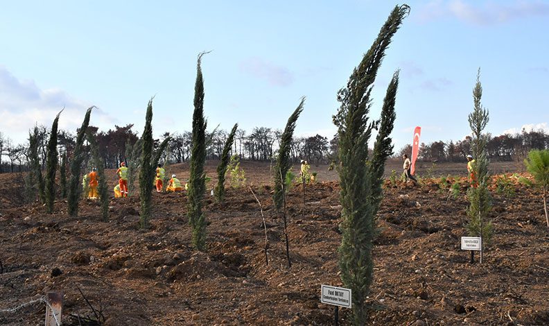 Yangının yaralarını sarmak için hemen çalışmalara başladıklarını bildiren Dikici, “Ormancılık yönünden önce alanı planladık, ‘Ne kadar alan yandı, ne yaparız da yeşil alan getiririz?’ diye çalıştık. Allah’a şükür ağaçlandırma çalışmalarında yüzde 90’a geldik. Yüzde 10’luk kesimde çok sarp tabiata bırakacağımız o alanlarda 30 bin hektar tabi tensil planlamıştık. Yaklaşık 25 bine yakın tabi tensili tamamladık. Buraya 1 milyon 650 bin fidan diktik. Geriye kalan suni tensillerin üzerinin temizliği bittiği için ihaleye çıkıldı, saha temizliklerine, sürümlerine başladık, sonbaharda da onların dikimlerini tamamlayacağız. Yeniden yeşil 4 ilçe için çalışmalarımızı bu yıl sonunda bitireceğiz” diye konuştu.
