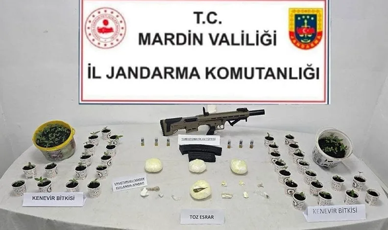 Mardin İl Jandarma Komutanlığı KOM Şube Müdürlüğü ve Midyat İlçe Jandarma Komutanlığı ekiplerince düzenlenen uyuşturucu operasyonunda adresleri belirlenen 3 şüpheli gözaltına alındı. Şüphelilerin adreslerinde ve üzüm bağında yapılan aramalarda 1 kilo 200 gram toz esrar, 161 kök kenevir bitkisi, 1 av tüfeği ile 1 adet uyuşturucu madde kullanma aparatı ele geçirildi. Gözaltına alınan 3 şüpheli, işlemlerinin ardından çıkarıldıkları mahkemece tutuklanarak cezaevine gönderildi.