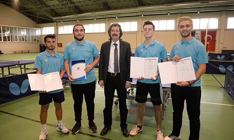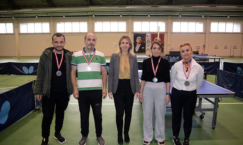 Birimlerarası iletişimin güçlendirilmesi ve personel motivasyonunun arttırılması hedefiyle düzenlenen Masa Tenisi Turnuvası, final mücadelelerinin ardından sona erdi. Kadın ve erkeklerin ayrı kategorilerde yarıştığı organizasyonda en iyiler belli oldu. Çekişmeli maçların yapıldığı turnuvada dereceye girenlere madalyaları BUÜ Rektör Yardımcısı Prof. Dr. Ferudun Yılmaz, Spor Bilimleri Fakültesi Dekanı Prof. Dr. Ramiz Arabacı ve üniversite yöneticileri tarafından takdim edildi.