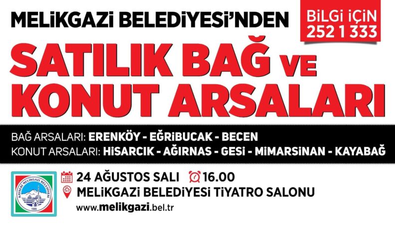 Melikgazi Belediyesi, mülkiyeti kendisine ait olan toplam 26 adet arsanın 24 Ağustos Salı günü ihale ile satışını yapacak. İhalelere ilişkin kapsamlı bilgiler yayımlanan ilanla kamuoyuna duyuruldu.