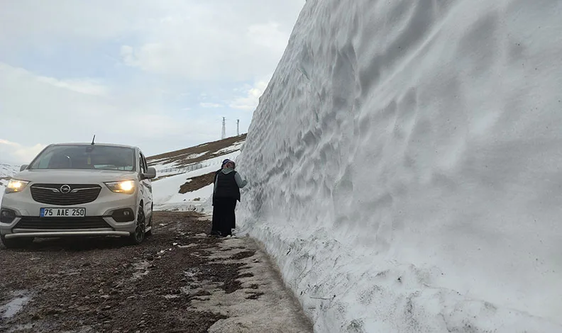 Ardahan-Şavşat karayolu üzerinde deniz seviyesinden 2 bin 540 metre yükseklikteki Sahara geçidinin çığ geleneler Mevkii’nde yaklaşık 4 metre boyunda kar var. Karayolunu kullanan sürücüler bu bölgede durarak hatıra fotoğrafı çekiyor.