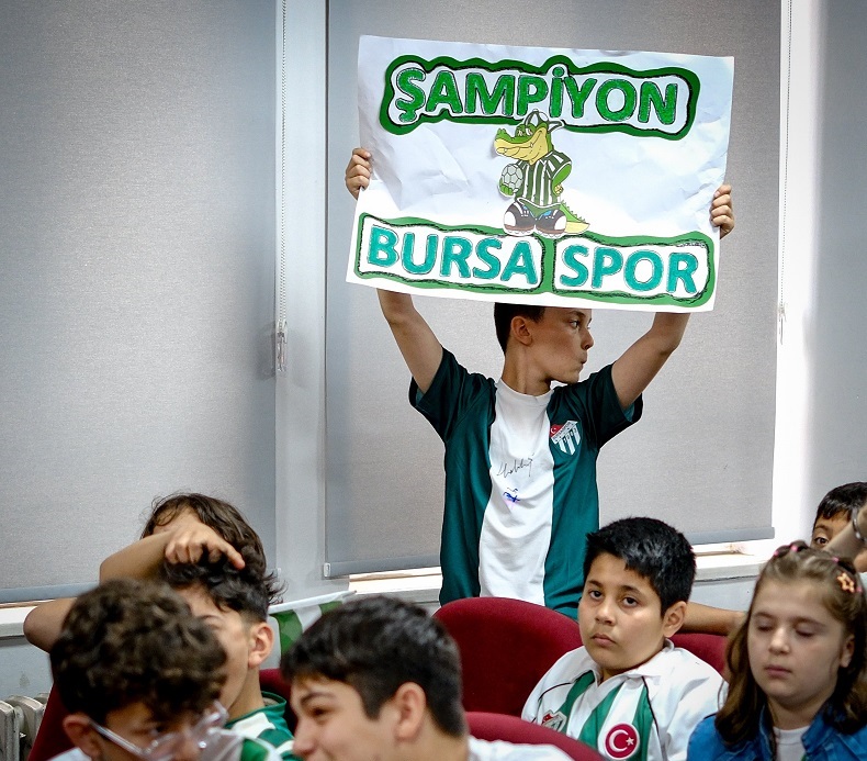 TFF 3. Lig 1. Grup’ta şampiyonluğa ulaşan Bursaspor’un sevinci kent genelinde dalga dalga yayılıyor. Yeşil-beyazlı kulübün futbolcuları, bu kez Şehit Yunus Yılmaz Ortaokulu’na konuk olarak öğrencilerle bir araya geldi.