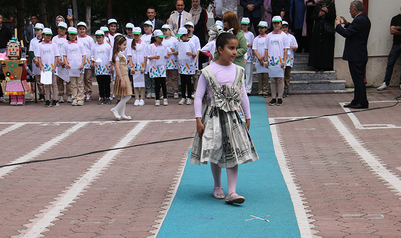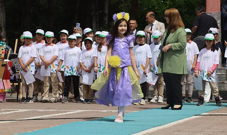 Annesiyle berber tasarladığı kıyafetinin atık gazetelerden oluştuğunu belirten 3.sınıf öğrencisi Sümeyye Demir, “Bu kıyafeti annemin yardımı ile beraber hazırladık. Benim kıyafetim atık gazetelerden oluşuyor. Atıklardan oluşturduğumuz defilemiz için böyle bir kıyafet tasarlamak istedim. Herkes atık kâğıtları, plastikleri ve pilleri doğaya atmak yerine geri dönüşüm kutularına atmalı. Daha güzel bir gelecek için ormanları kirletmemeli ve dünyamızın temizliği için elimizden geleni yapmalıyız” dedi.
