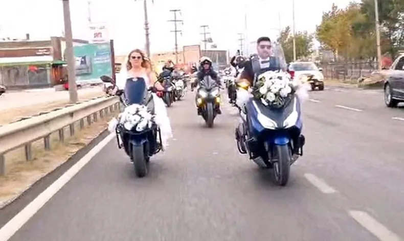 Motosiklet tutkunu Muammer ve Bedia Zeren çiftçi düğün konvoyunda farklı bir etkinliğe imza attı. Motosikletlerini gelin araçlarına çeviren çift gelinlik ve damatlık giyerek konvoy yaptılar. Çiftin yakın arkadaşları da motosikletleriyle konvoya katılarak renk kattılar. Çift motosikletleriyle önde seyrederken konvoydaki motosiklet tutkunları da onları takip etti. Konvoydaki bazı sürücülerin tek teker seyretmesi tehlikeli anlar yaşattı.