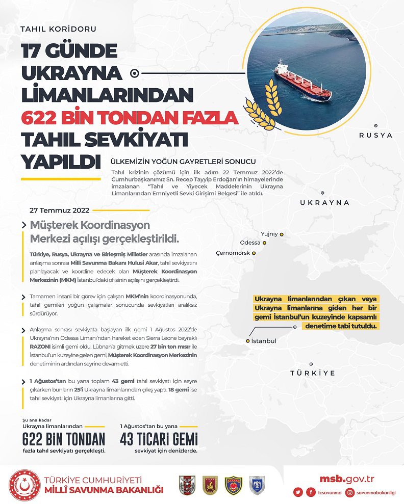 “Ülkemizin yoğun gayretleri sonucu tahıl krizinin çözümü için ilk adım 22 Temmuz 2022’de Cumhurbaşkanı Recep Tayyip Erdoğan’ın himayelerinde imzalanan ‘Tahıl ve Yiyecek Maddelerinin Ukrayna Limanlarından Emniyetli Sevki Girişimi Belgesi’ ile atıldı. Türkiye, Rusya, Ukrayna ve Birleşmiş Milletler arasında imzalanan anlaşma sonrası Milli Savunma Bakanı Hulusi Akar, tahıl sevkiyatını planlayacak ve koordine edecek olan Müşterek Koordinasyon Merkezinin (MKM) İstanbul’daki ofisinin açılışını gerçekleştirdi. Tamamen insani bir görev için çalışan MKM’nin koordinasyonunda, tahıl gemileri yoğun çalışmalar sonucunda sevkiyatları aralıksız sürdürüyor.
