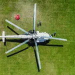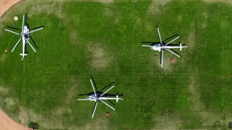 Muğla’daki yangınlara havadan müdahale eden helikopterlerin stadyumdaki ikmal alanı ile helikopter ve personellerin göreve hazırlanışı havadan görüntülendi.