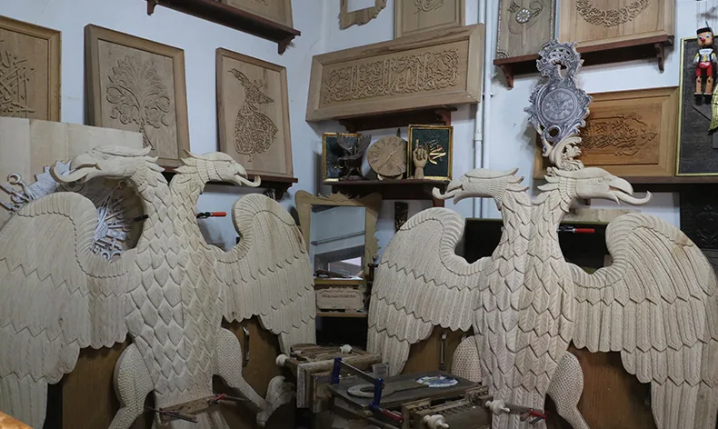 Ahşapta genelde yekpare ağaç kullanıldığı algısı var fakat öyle değil diyen Daştan, “Çift başlıklı kartal figürünün, Selçuklu devletin ötesine kadar dayanan bir anlamı var. Selçuklu devletinin arması çift başlıklı kartaldır. Şimdi bir futbol takımının sembolü, farklı medeniyetler de kullanıyor ama bizim bakış açımızda Selçuklu devletinin kullandığı sembol var. Sağ ve sola bakan çift baş, doğu ve batının hâkimi olan bir anlamı var. Güç özgürlük asalet gibi anlamlar yüklenmiş kartala. Biz de bunu geleneksel anlamı koruyarak çift başlı kartları birçok yerde figür olarak kullanıyoruz. İl ve yurtdışına gönderdiğimiz işler var. Sosyal medyanın yaygınlığı bizim işlerimize olumlu yöne yansıyor. Biz de kullanıp avantaja çeviriyoruz. Genelde yekpare ağaç kullanıldığı algısı var fakat öyle değil. Ahşapta tek parça ağaç kullanılmaz tasvip de edilmez. Tek parça ağacın eğilme ihtimali, liflerin birbirini çekme olayı yoğun olur. Bu nedenle mümkün oldukça ağaçları küçük parçalar halinde dilimler liflerini öldürürüz. Sonra tekrar yapıştırır kullanırız. Çok zahmetli ama olmak zorunda” dedi.