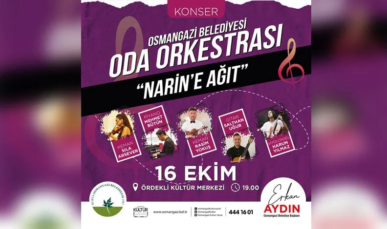 Osmangazi Belediyesi tarafından 16 Ekim Çarşamba günü saat 19.00’da gerçekleştirilecek olan Oda Orkestrası Konseri, Diyarbakır’da cinayete kurban giden 8 yaşındaki Narin Güran’a ağıt temasıyla gerçekleştirilecek.