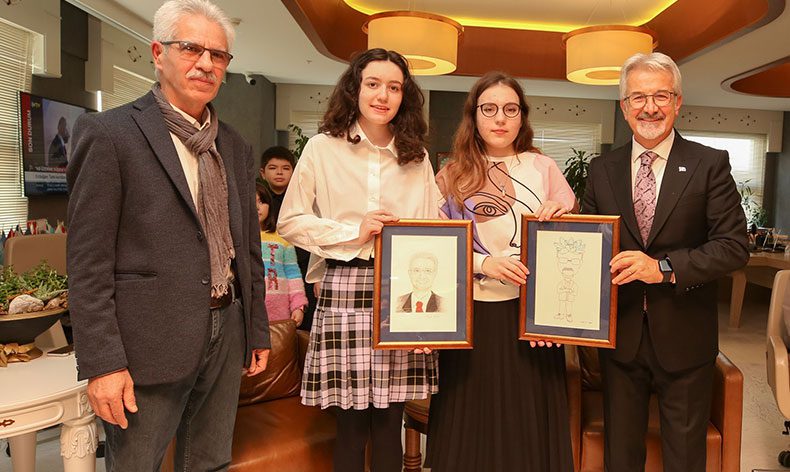 Ziyarette Başkan Erdem’e bir de sürpriz yapıldı. Nilüfer Belediyesi Karikatür Atölyesi öğrencileri Canan Ezgi Ayan, Zeynep Norman ve karikatür atölyesinde gönüllü olarak eğitim veren Halit Kurtulmuş, Başkan Erdem’e, karikatür portre çalışmalarını hediye etti.