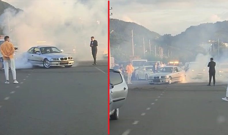 Kaydedilen görüntülerde, drift yapan otomobilin sürekli olarak kendi etrafında döndüğü, lastik yakarak duman çıkarttığı anlar yer alırken, damadın ise sürücüye alkış ile destek verdiği, diğer sürücülerin ise tepki gösterdiği ve bir kameramanın o anları kaydettiği görünüyor.