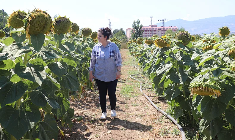 Ziraat Fakültesi Tarla Bitkileri Bölümü Endüstri Bitkileri bölümü Dr. Şaziye Dökülen” Burada çalışma alanlarımızdan ayçiçeği bitkisi vardır. Ayçiçeği bitkisi gübreleme çalışmasını yürütüyoruz. Burada kimyasal gübre dozları ve organamineral gübre dozları kullanılmaktadır. Organamineral gübre şu anda gündemde olan bir gübre çeşididir. Organamineral gübre kimyasal ve organik maddelerin yani gübrelerin birlikte harmanlanarak kullanılmasıdır. Yani bir tarafta sadece kimyasal gübre kullanımı söz konusu, bir tarafta ise hem organik hem de kimyasal gübre kullanımı söz konusudur. Aynı zamanda bunların dekara ne kadar verim verebileceğini ölçmek için de belirli dozları bulunuyor. Dekara 3,6,9,12,15 ve 18 kg olmak üzere bu şekilde çalışmalarımızı yürütüyoruz. Bu ayçiçeği çeşidi yağlık bir çeşittir. Tokat bölgesi ayçiçeği üretiminde ön planda olan iller arasında yer alıyor. Ayçiçeği ülkemizde yağ bitkileri açısından ilk sırada yer alan bir bitkidir. Biz de gerek çiftçiye gerekse bilimsel anlamdan yani literatür kaynağı olmak adına, hangi gübrenin gerek verimine gerek yağ oranına ne tür fayda sağlayacağını görmek adına bu çalışmayı yürütüyoruz. Bu yıl bu çalışmamızın ilk yılı bir daha ki yıl tekrarlanacak ve 2 yılın sonucuna göre şu gübre organamineral gübre veya kimyasal gübrenin şu dozları diye kullanılması geçerliliğinin tavsiyesinde bulunulacak” diye konuştu.