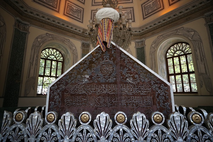 Sevim, sekizgen planlı, üzeri kubbeyle örtülü türbenin ortasındaki Osman Gazi’ye ait ahşap sandukanın etrafının sedef kakmalı, pirinç parmaklıklarla çevrili ve sandukanın üzerinin sırma işlemeli kadifeyle örtülü olduğunu sözlerine ekledi.