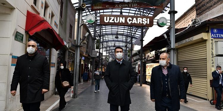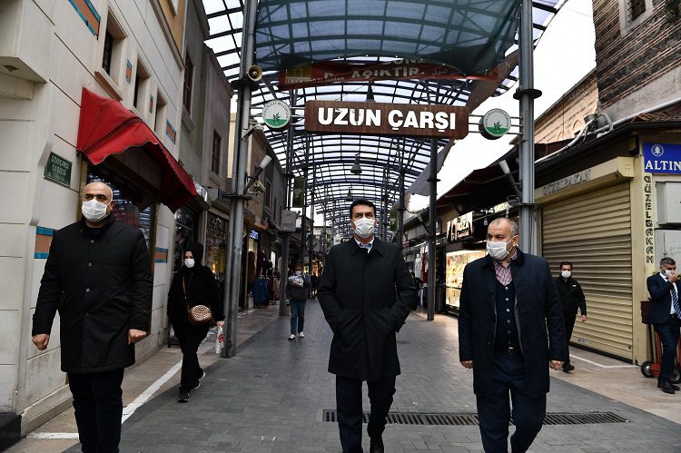 Osmangazi Belediye Başkanı Mustafa Dündar, korona virüs nedeniyle ekonomik ve sosyal hayatımızın farklı bir noktaya geldiğini ifade ederek, “Türkiye, aldığı ciddi tedbirler sayesinde korona virüs ile mücadele sürecini çok güzel bir şekilde yönetti ve yönetmeye devam ediyor. Cumhurbaşkanımız Recep Tayyip Erdoğan’ın yapmış olduğu bu kriz yönetiminin başarısı, tüm dünya ülkelerine örnek oldu. İnşallah, bu süreci en kısa sürede atlatarak, normal hayatımıza döneriz. Bu süreçte, vatandaşlarımızın kurallara ve uzmanların tekliflerine uyması, daha kısa sürede normal hayata döneceğimizin işaretlerini veriyor. Tarihî çarşı ve hanlar bölgesinde yer alan dükkanlarımız 1 aydır kapalıydı. Bu bölge, Bursa’da ticaretin kalbinin attığı yer konumunda. Vatandaşımızın da en yoğun geldiği yer burası. Pazartesi gününden itibaren bölgedeki dükkânlar açılmaya başladı. Önümüzdeki 4 gün için getirilen sokağa çıkma yasağı ve ramazan ayının gelmesi dolayısıyla vatandaşlarımızın alışveriş yapma ihtiyacı, çarşı bölgesinde bir hareketlilik yaşanmasına neden oldu. Vatandaşlarımız bu alış veriş ortamında, sosyal mesafe kuralına uymaya dikkat etsinler. Maskelerini takmadan dışarıya çıkmasınlar” dedi.
