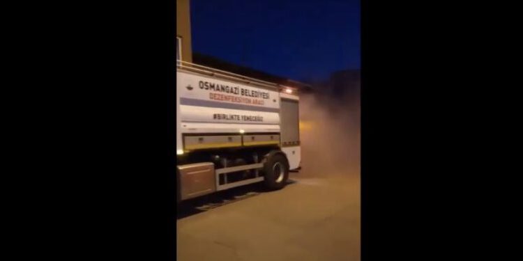 Salgının yayılmaması için dört koldan adeta seferberlik ilan eden Osmangazi Belediyesi’nin özel koronasavar aracının sabah saat 06.00 karşısında gören bir vatandaşın cep telefonuyla çektiği video paylaşımı ilgi çekti.