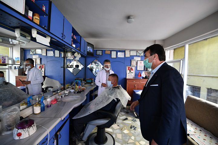 Dünyayı etkisi altına alan yeni tip korona virüs salgınına karşı İçişleri Bakanlığı’nın genelgesi ile faaliyetlerine 21 Mart tarihi itibariyle geçici olarak ara veren berber ve kuaförler, 11 Mayıs Pazartesi günüyle birlikte yeniden hizmete başladı. Osmangazi Belediye Başkanı Mustafa Dündar, 50 günün ardından kapılarını açan berber ve kuaför esnafını ziyaret etti. Esnafa maske dağıtan Başkan Dündar, hayırlı işler temennisinde bulundu. Salgın dolayısıyla hayatın birçok noktasında değişiklikler yaşadığımıza vurgu yapan Dündar, berber ve kuaför esnafının da virüs nedeniyle yeni bir döneme girdiğini ifade etti. Başkan Dündar, bu yeni sürece hazır olmaları açısından Osmangazi’de faaliyet gösteren yaklaşık 1400 berber ve kuaför dükkanını dezenfekte ederek müşterilerin kullanımına hazır hale getirdiklerini söyledi.
