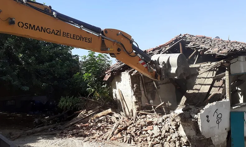 Osmangazi Belediyesi, vatandaşların emniyeti ve sağlığı açısından risk oluşturan metruk binaların yıkımını sürdürüyor. Vatandaşlardan gelen talep ve şikayetleri dikkate alan Yapı Kontrol Müdürlüğü ekipleri, son olarak Hamitler Mahallesi Tepe Sokak üzerinde yer alan metruk binayı yıktı. Belediye ekipleri, hukuki ve idari süreçleri tamamlanan binanın yıkımı sırasında herhangi bir olumsuzluk yaşanmaması için yıkım öncesinde gerekli tüm tedbirleri aldı. Yıkımın ardından ortaya çıkan molozlar ise belediye ekipleri tarafından kamyonlara yüklendi.