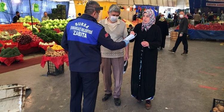 İçişleri Bakanlığı’nca korona virüs önlemleri kapsamında yayınlanan genelge kapsamında aralarında Bursa’nın da bulunduğu 31 şehirde uygulanan 4 günlük sokağa çıkma yasağı, sona erdi. Yasağın ardından vatandaşlar, pazar yerlerine adeta akın etti. Osmangazi Belediyesi Zabıta Müdürlüğü ekipleri, Ramazan ayı olması dolayısıyla da normal günlere oranla iki katı insanın geldiği pazar yerlerinde korona virüs önlemlerini üst seviyeye çıkardı.