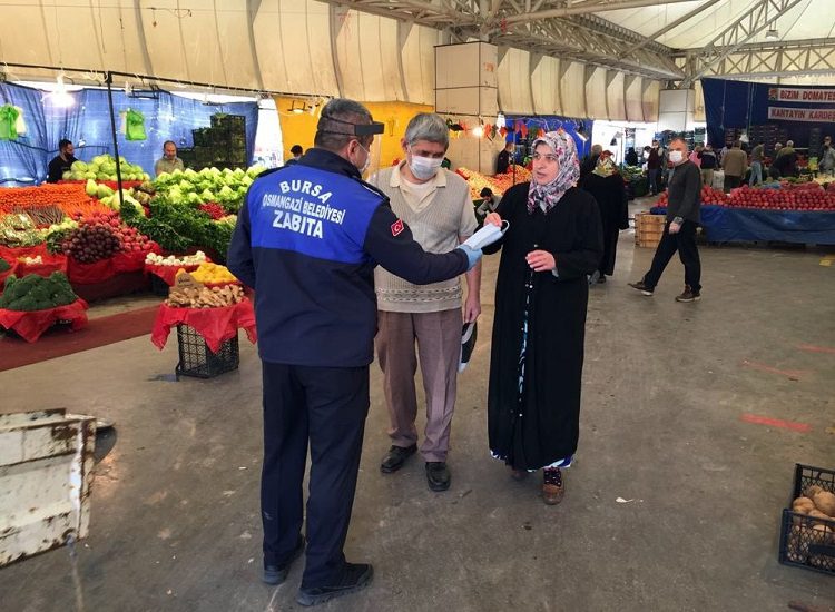 İçişleri Bakanlığı’nca korona virüs önlemleri kapsamında yayınlanan genelge kapsamında aralarında Bursa’nın da bulunduğu 31 şehirde uygulanan 4 günlük sokağa çıkma yasağı, sona erdi. Yasağın ardından vatandaşlar, pazar yerlerine adeta akın etti. Osmangazi Belediyesi Zabıta Müdürlüğü ekipleri, Ramazan ayı olması dolayısıyla da normal günlere oranla iki katı insanın geldiği pazar yerlerinde korona virüs önlemlerini üst seviyeye çıkardı.