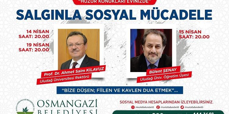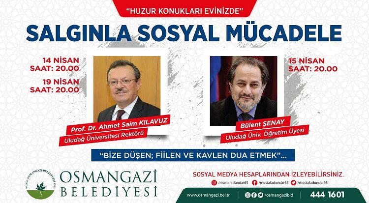 Osmangazi Belediyesi, Çin’de başlayıp, dünyayı etkisi altına alan ve Türkiye’de de ölümlere yol açan koronavirüse karşı her türlü tedbiri alırken, vatandaşlar için farklı uygulamalara imza atıyor. ‘Huzur Konukları Evinizde’ adlı etkinlik ile Uludağ Üniversitesi Rektörü Prof. Dr. Ahmet Saim Kılavuz ile birlikte birbirinden değerli akademisyenler ve edebiyatçılar her akşam saat 20.00’de Osmangazi Belediyesi’nin sosyal medya hesapları üzerinden Osmangazililerin evlerine konuk olacak.