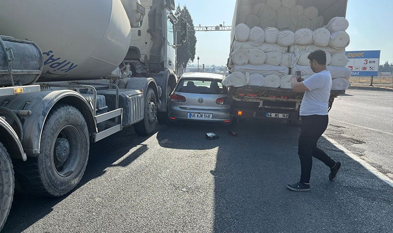 Kaza, Kahramanmaraş doğu çevre yolu üzerinde meydana geldi. Sürüsünün ismi öğrenilemeyen otomobil seyir halindeyken, kumaş yüklü kamyon ve beton mikseri iş makinası arasında sıkıştı.