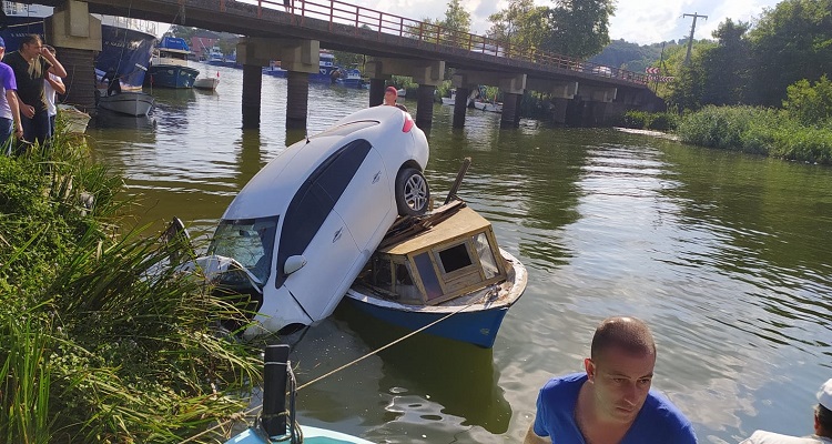 Düzce’nin Akçakoca ilçesinde, sürücüsünün geri manevra sırasında kontrolünü kaybettiği otomobil, nehir kenarındaki teknenin üzerine çıktı. Aracın ön kısmı, suya gömülürken, sürücü ve yanındaki kadın kazada yaralanmadı.