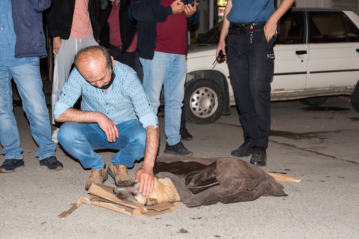 Ceketini yaralı hayvanın üzerine örten Doğan, köpeği kafasını okşayarak sevdi, onu sakinleştirmeye çalıştı.