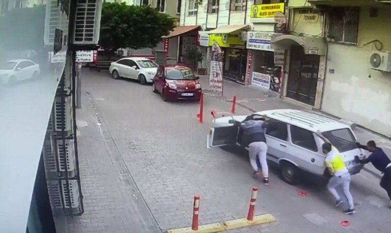 Öte yandan şüphelilerin aracı ittirerek çaldıkları anlara ilişkin güvenlik kamerası görüntüleri de ortaya çıktı.