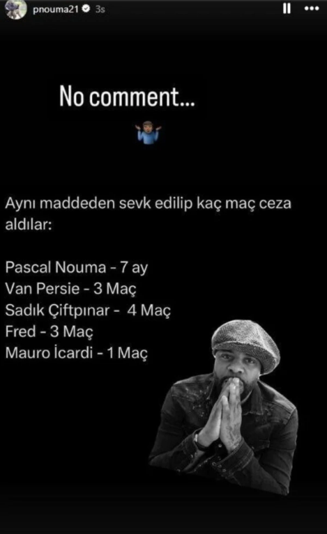 Icardi’nin bu cezasına Beşiktaş’ın eski yıldızı Pascal Nouma’dan tepki geldi. Benzer olaylarda alınan cezaları paylaşan Fransız eski yıldız, “Yorum yok” ifadelerini yazdı.