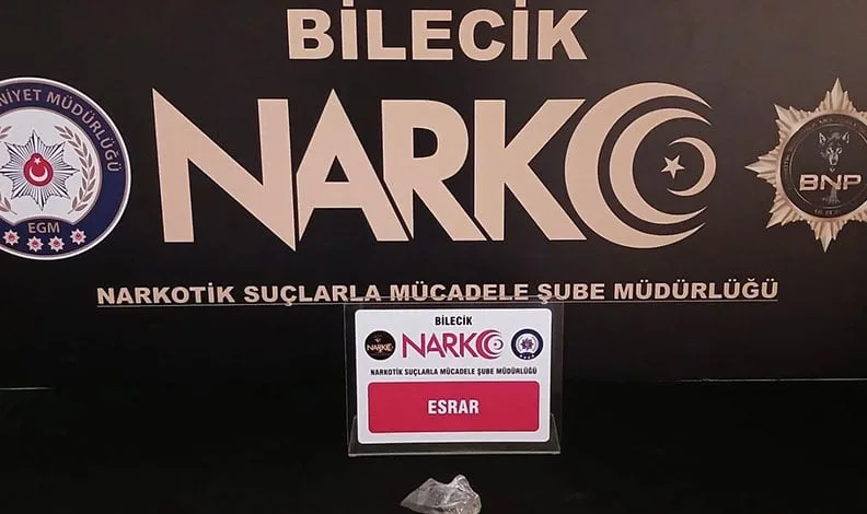 Bilecik’te polis ekiplerinin şüpheli hareketlerde bulunan bir şahsı, ekiplerin üzerine geldiği görünce elindeki kağıt parçasını yere attı. Ekipler şahsı alırken, yerdeki kağıt parçasının içinden 0,31 gram ağırlığında esrar çıktı. Şüpheli şahıs hakkında NARKO ekiplerince ‘TCK 191-kullanmak için uyuşturucu veya uyarıcı madde satın almak, kabul etmek veya bulundurmak’ suçu kapsamında yasal işlem başlatıldığı öğrenildi.