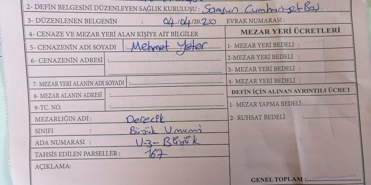 Nereden alındığı bilinmeyen ve Cumhuriyet Savıcı tarafından Samsun Büyükşehir Belediyesi, Mezarlıklar Müdürlüğü’ne gönderilen yazıda “Mehmet Yeter isimli ….. T.C kimlik numaralı hükümlü koronavirüs salgın hastalığına bağlı nedenlerden dolayı vefat etmiştir.” denildi.