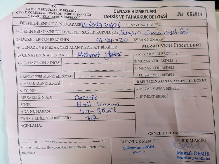 Nereden alındığı bilinmeyen ve Cumhuriyet Savıcı tarafından Samsun Büyükşehir Belediyesi, Mezarlıklar Müdürlüğü’ne gönderilen yazıda “Mehmet Yeter isimli ….. T.C kimlik numaralı hükümlü koronavirüs salgın hastalığına bağlı nedenlerden dolayı vefat etmiştir.” denildi.