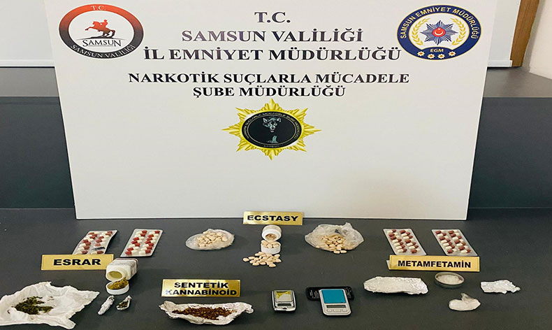 Edinilen bilgiye göre, Samsun Emniyet Müdürlüğü Narkotik Suçlarla Mücadele Şube Müdürlüğü ekipleri alınan istihbari bilgiler doğrultusunda Atakum ilçesi Küçükkolpınar Mahallesi ile İlkadım ilçesi Cedit Mahallesi’nde bulunan 2 zehir tacirinin ikametlerine operasyon düzenledi. Yapılan aramalarda, 1079 adet sentetik ecza, 267 adet ecstasy, 13,51 gram metamfetamin, 3,41 gram esrar, 1,19 gram sentetik kannabinoid, 2 adet hassas terazi, 2 adet uyuşturucu kullanım aparatı ele geçirdi. Olayla ilgili 2 kişi gözaltına alındı.