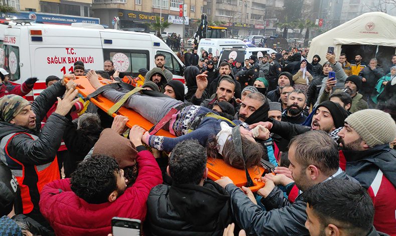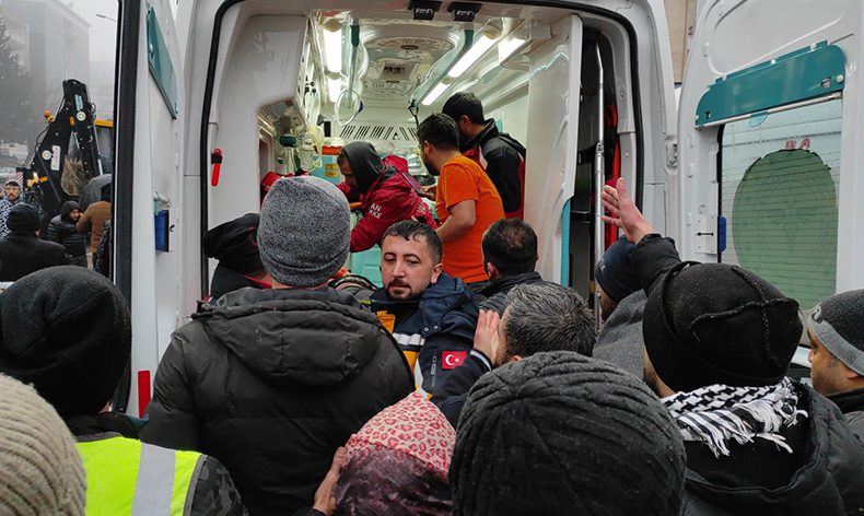 Şanlıurfa’da depremin ardından yıkılan binalarda enkaz kaldırma çalışmaları devam ediyor. Ekiplerin yoğun çalışmasıyla Haliliye ilçesine bağlı Ahmet Erseven Mahallesinde yıkılan bir binanın enkazı altından yaralı olarak çıkarılan biri çocuk 2 kişi, sedye ile omuzlarda taşınarak ambulansa konuldu. Sağlık durumları iyi olan yaralılar, hastaneye kaldırıldı. Enkaz kaldırma çalışmaları sürüyor.