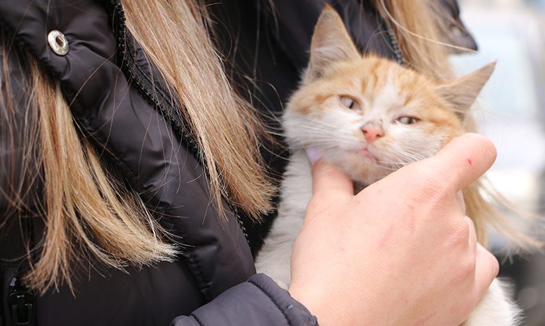 Güvenlik güçlerinin kurtardığı yavru kedi şefkatli kollarda sevmesiyle panik ortamı yumuşadı. O anlar kameralara yansıdı.