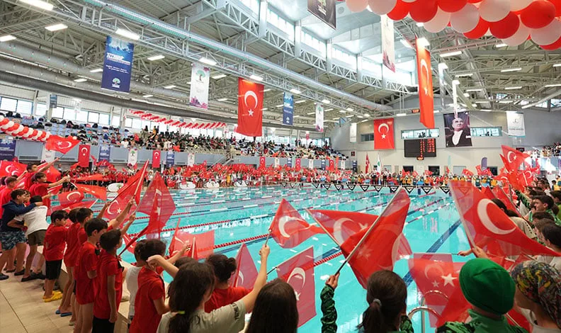 Uluslararası arenada şampiyonlar çıkaran Alleben 1 Yüzme Havuzu’nda Cumhuriyet Bayramı coşkusu doyasıya yaşandı. Aileler ellerinde Türk bayraklarıyla çocuklarına destek verirken, sık sık Cumhuriyet’imizin kurucusu Gazi Mustafa Kemal Atatürk sloganları attı.