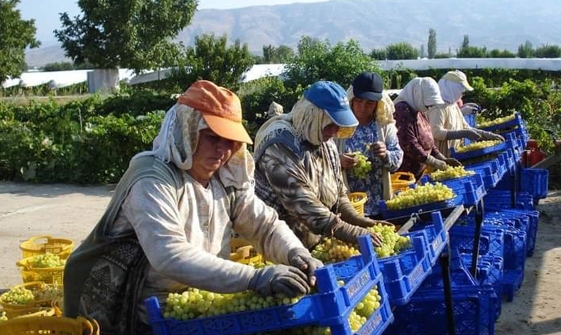Hava sıcaklığının 40 derecenin üzerinde olmasına rağmen sabah 06.00 sıralarında üzüm bağında olan işçiler kamyon dolana kadar çalışıp yevmiyelerini kazanıyor. Sabah minibüsle üzüm bağına giren üzüm işçileri kesim, kasa çekimi, kamyon yükleme gibi iş taksimi yapıp kamyonu doldurunca işlerini bitiriyor. Günlük 400 TL yevmiye alan kadın işçiler ise aşırı sıcaklara karşı başlarına sarık takıp sarığın da üstüne şapka takarak sıcaklara karşı önlemlerini alıyor.