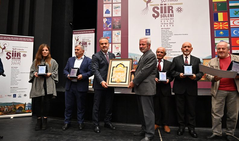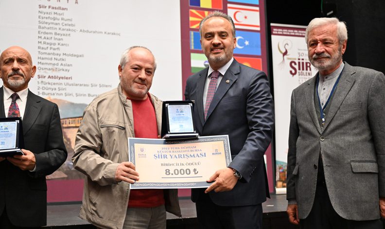 Konuşmaların ardından, Mehmet Doğan tarafından Başkan Alinur Aktaş’a teşekkür Berat’ı verildi. Ayrıca Büyükşehir Belediyesi tarafından 2022 Türk Dünyası Kültür Başkenti Bursa etkinlikleri kapsamında düzenlenen ‘Türk Dünyası’ konulu şiir yarışmasının kazananlarına da ödülleri takdim edildi. Talat Ülker ‘Azatlık Türküsü’ şiiriyle birinci, Mustafa Bilir ‘Türk’ün Türküsü’ şiiriyle ikinci ve Durmuş Kaya da ‘Sana Baktığım Zaman’ şiiriyle üçüncü oldu. Birinciye 8 bin, ikinciye 6 bin, üçüncüye de 4 bin TL para ödülü verildi. Adem Alan ‘Ufka Yolculuk’ şiiriyle ve Yunus Laçin de ‘Dasitan-ı Türk Dünyası’ şiiriyle 2 bin TL’lik mansiyon ödülü aldı. Yarışmada, Gular Ismailova da ‘Türk’ün Devlet Ağacı’ şiiriyle Seçici Kurul Özel Ödülü’ne layık görüldü.