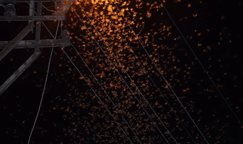 Şırnak’ın Beytüşşebap ilçesinde aşırı sıcaklar nedeniyle akşam vakti sokak lambalarına toplanan binlerce çekirge vatandaşları evlerine hapsetti.