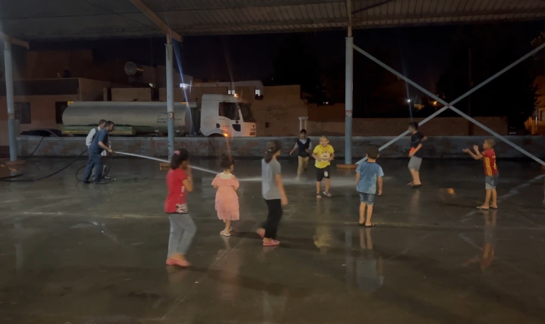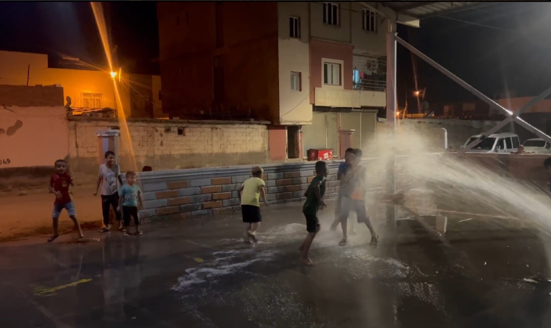 Pazar yerine gelen araç, beton zemini yıkarken çocuklar ise hortumun önünde durarak hem oyun oynuyor hem de serinliyor. Belediye ekipleri de çocukların oyununa eşlik edip hortumla su sıkıyor. Uzun süre suyla oyun oynayan çocuklar, aracın bölgeden ayrılmasıyla birlikte evlerinin yolunu tutuyor. Şanlıurfa’nın çok sıcak olduğunu söyleyen çocuklar, hem serinlediklerini hem de oyun oynadıklarını belirtti.