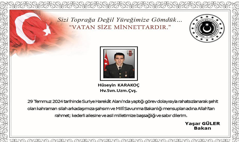 “29 Temmuz 2024 tarihinde Suriye Harekat Alanı’nda görev esnasında rahatsızlanarak şehit olan kahraman silah arkadaşımız Uzman Çavuş Hüseyin Karakoç’a Allah’tan rahmet; kederli ailesine ve asil milletimize başsağlığı ve sabır dilerim.”