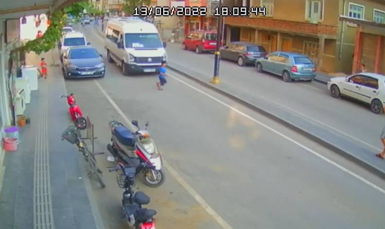 Çevredekiler ve sürücünün yüreği ağzına gelirken, küçük çocuk olay yerinden oynayarak ayrıldı. Yaşananlar ise güvenlik kamerasına yansıdı.