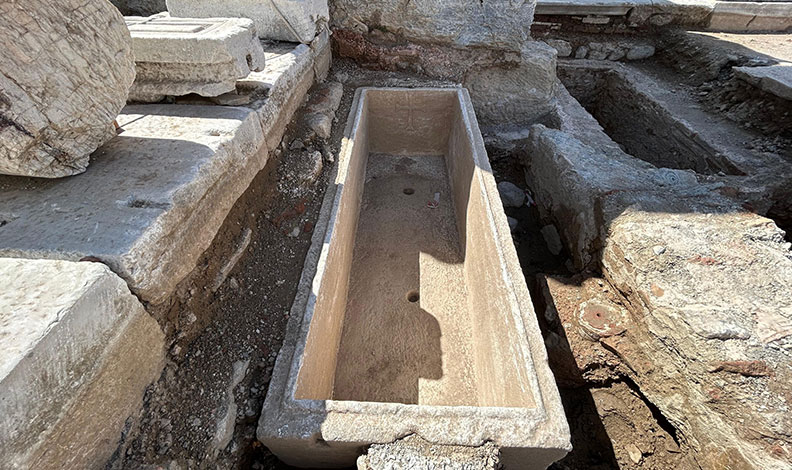 Doç. Dr. Sinan Mimaroğlu, çalışmalar sırasında kendilerini şaşırtan olayın, toprağın hemen 20 santim aşağısında su kanalı, künk sitemi, mozaiklerin yanı sıra; alanda 1 tane lahit ve 3 tane lahit formlu örme mezarın olduğunu ve lahitin içinde 12 tane bireyin ortaya çıktığını ifade etti. Lahit içerisinde toplu bir gömünün de olduğuna işaret eden Mimaroğlu, “Lahit bir Roma lahiti. Üzerinde de çok güzel bir epik kitabe bulunmakta. Romalı bir gladyatöre ait. Hristiyanlık döneminde iç tarafına üç tane haç kabartması yapılarak tekrardan kullanılmış” diye konuştu.